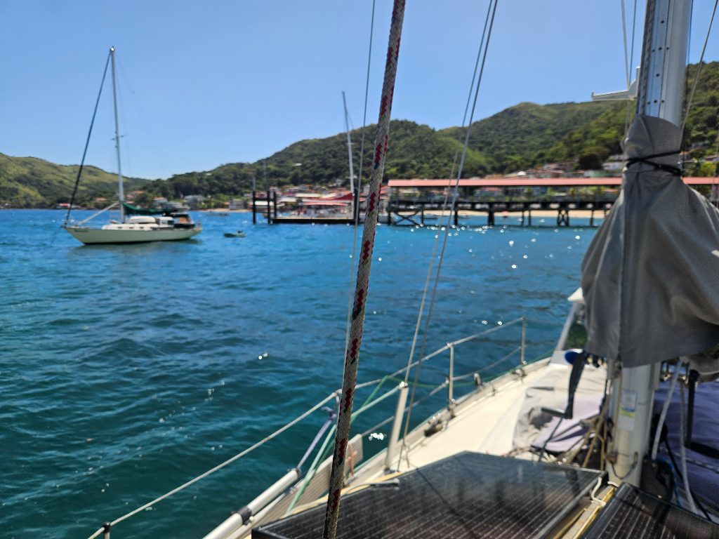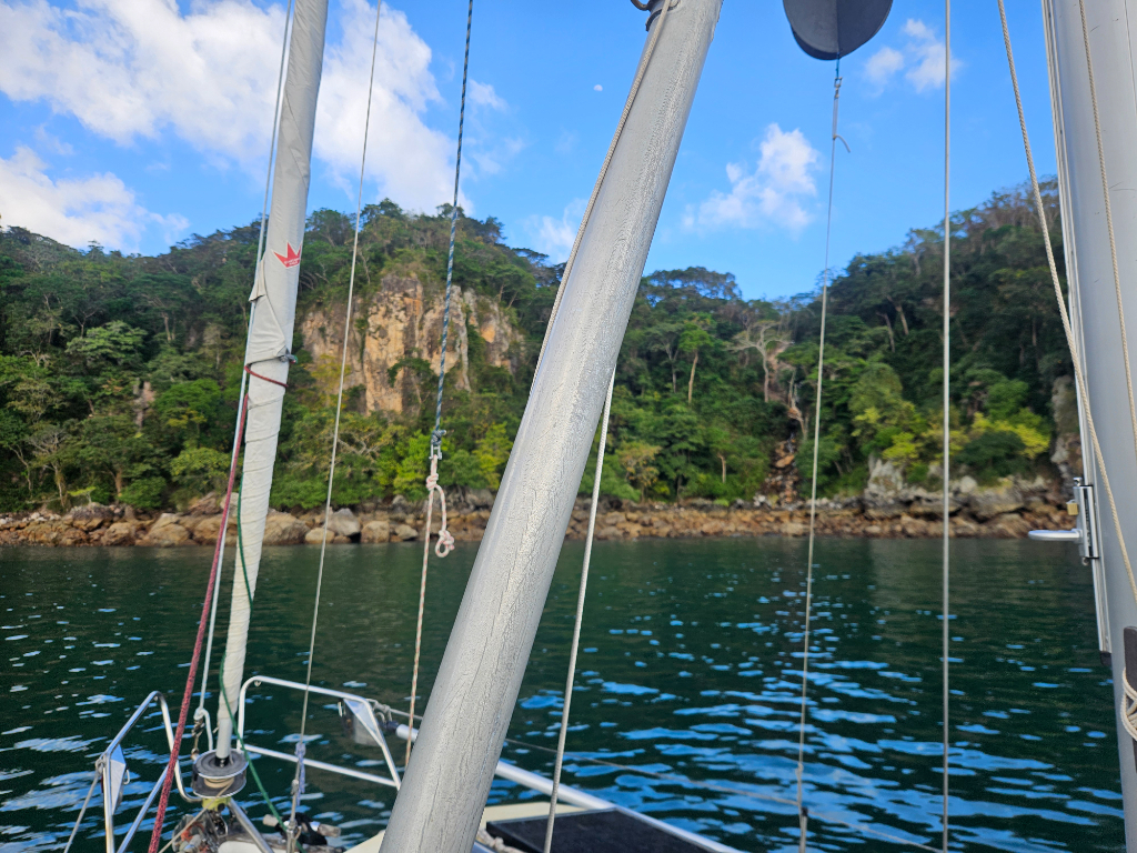 Anchor up, followed by the sails. Wind was around 12kn, but soon picked up to over 20. Good time to leave! We put in a reef and rounded the corner to the other side of Taboga. This had been recommended by Breezen, and indeed what a beautiful spot! The anchorage is quite deep, but well protected from the prevailing wind. Steep hills and a waterfall surround us, somewhat reminiscent of Scotland. But if there was shore life, it’d be crocodiles instead of seals.