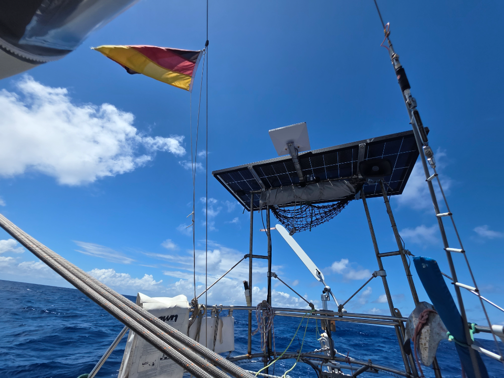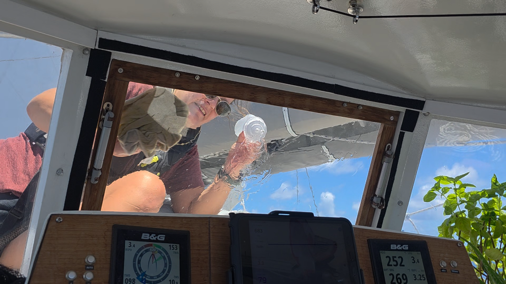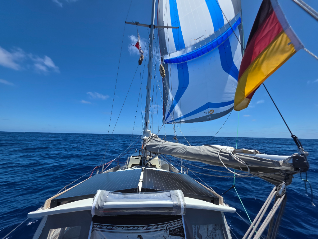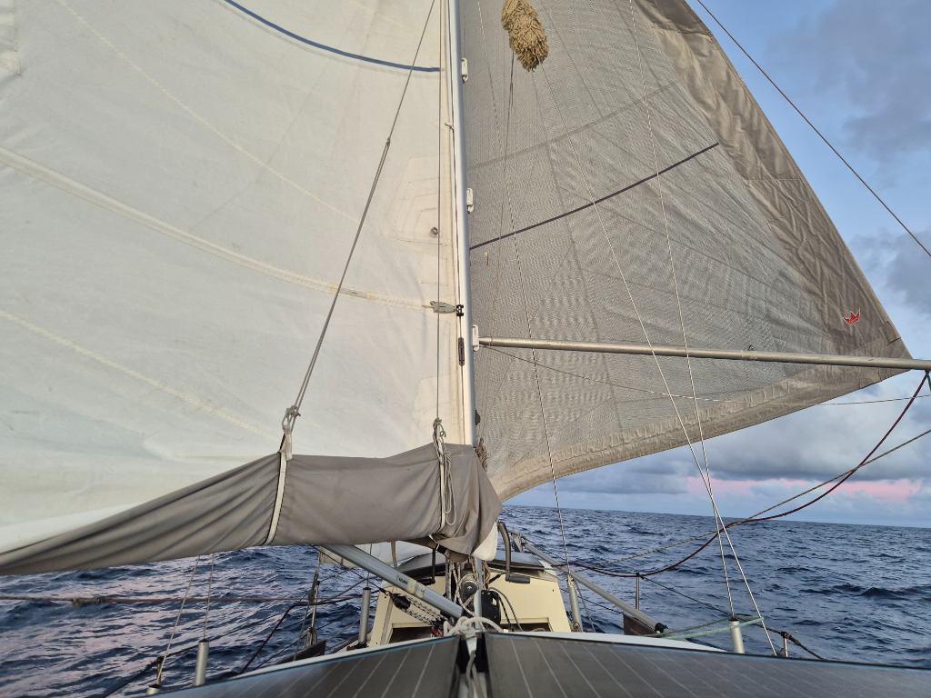 The boat starts showing the length of the passage. The sun cover strip of our genoa needs some re-stiching, we moved the windvane steering line by 20cm to move the slightly chafed bit away from the blocks, and our staysail had a little hole in the bottom that we fixed with some sail tape. The pole-out sheet we use with both sails got turned around as there was some significant chafe developing in it where it goes through the eye of the pole. The genoa sheets look like they want to be turned around so that the good end of the line replaces the parts where wear and tear are starting to take their toll. And the sides of the boat - brown with algae growth. Lille Ø will need some TLC after this one.