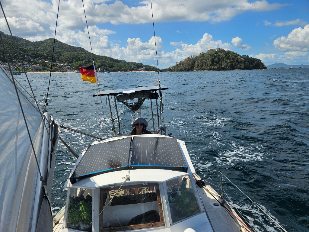 Anchor up, followed by the sails. Wind was around 12kn, but soon picked up to over 20. Good time to leave! We put in a reef and rounded the corner to the other side of Taboga. This had been recommended by Breezen, and indeed what a beautiful spot! The anchorage is quite deep, but well protected from the prevailing wind. Steep hills and a waterfall surround us, somewhat reminiscent of Scotland. But if there was shore life, it’d be crocodiles instead of seals.