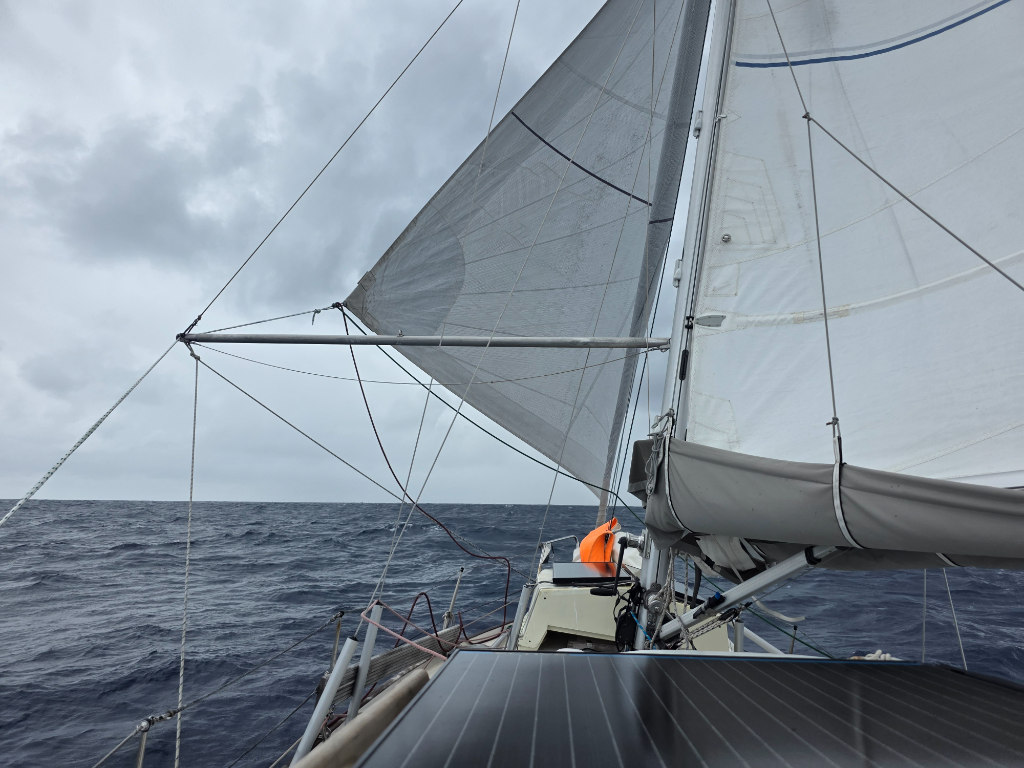 The night was again a smooth magic carpet ride under the starlit sky. But at dawn things became grey and wind picked up. We tucked in a reef. At 7°30 we made the turn west, wing on wing. This latitude should keep us below worst of the squally weather.