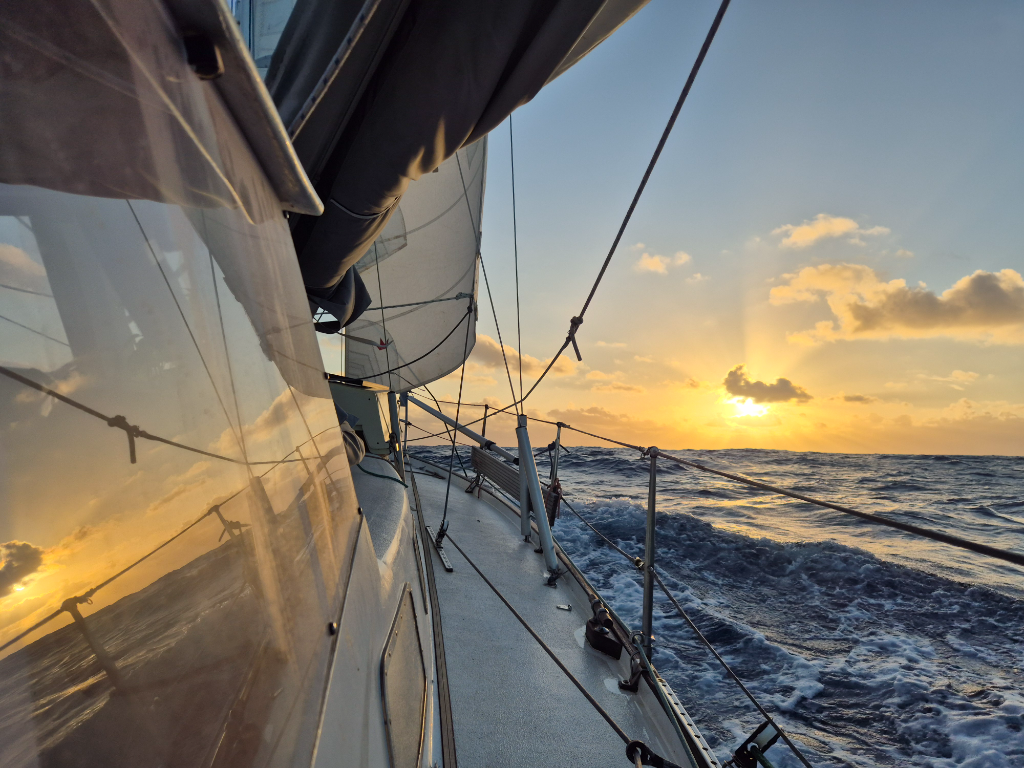 Main still in first reef and staysail on we greeted the sun and kept barreling up and down the waves. Wind has been shifting every few hours by 50ish degrees, so the seas are lumpy. Lille Ø bounces up and down, side to side. The hunt for things that haven’t yet settled to their spot is a sport to keep us occupied. And finding deep sleep in a bed not stable, a skill to be cherished.