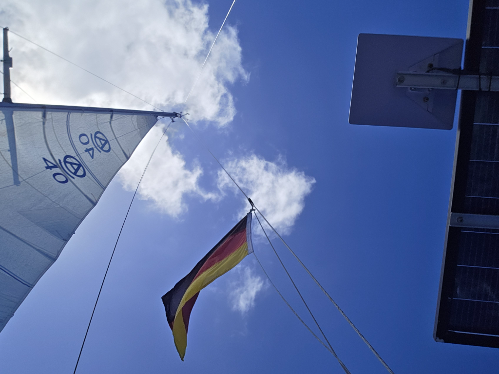 High winds and a bumpy ride continued throughout the night. Sky was mostly clear, and progress was good. At noon winds had subsided a bit, and we shook out the reef.