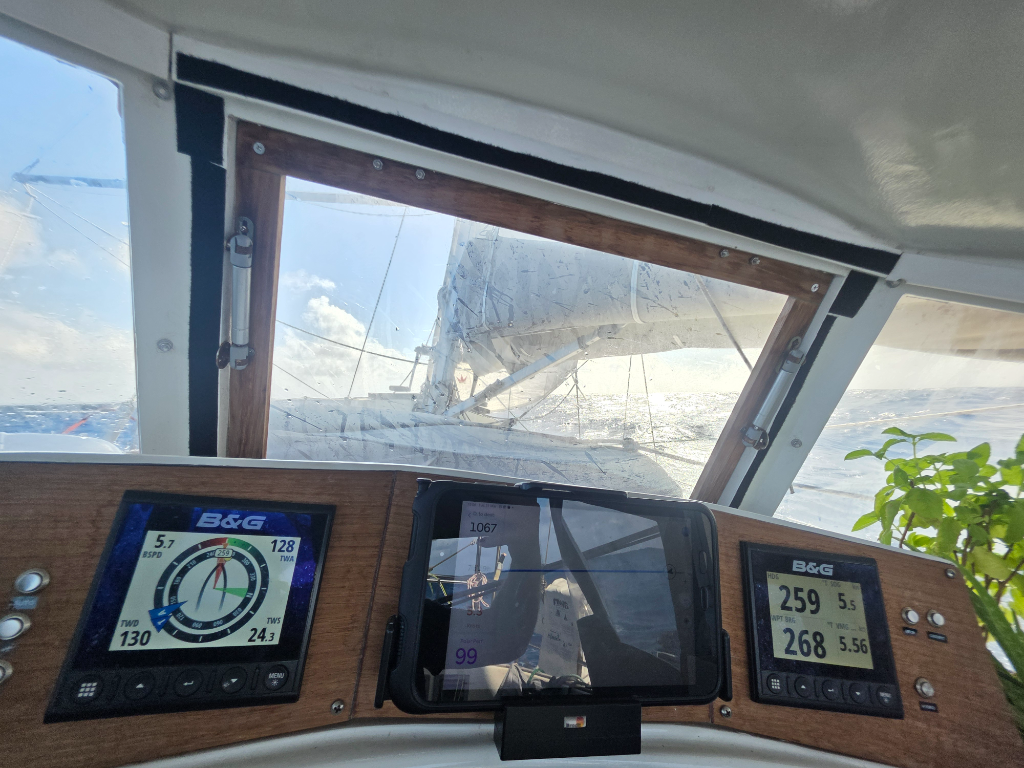 Today’s wind has a slight southern component, meaning that we’re now on port tack instead of poled out.