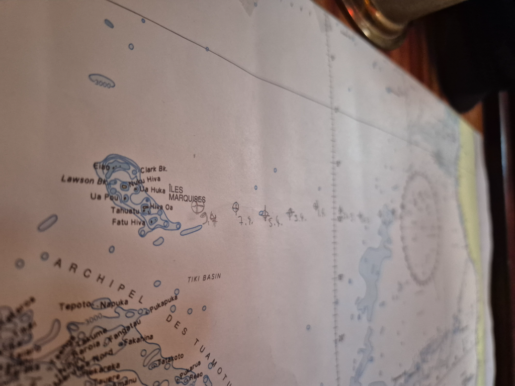 As our target draws nearer, we need to start paying a bit more attention to navigation. It is no longer enough to follow a roughly westerly course whichever way the wind blows. And so, we gybed right after dinner to gain a bit more northing.