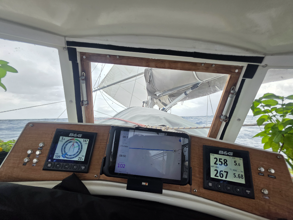 The morning didn’t turn bright, it turned grey. Squalls and lulls woven to each other like a gray wool blanket. The winds were varied as if they already could sense the land, and ebb and flow up and down simulating the tall volcanic slopes of the Marquesas. Eventually one of the squalls came with gusts over 30kn, so out in to the rain we went to put in a 2nd reef. After a while as the wind kept dropping we put back the 1st reef. This passage was going to test us till the very end.
